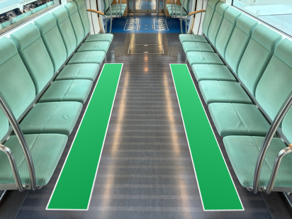 福岡市地下鉄では、七隈線の混雑緩和に向けたマナー啓発のため、車両の扉付近と座席足元に床サインを追加します。